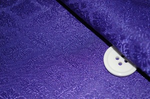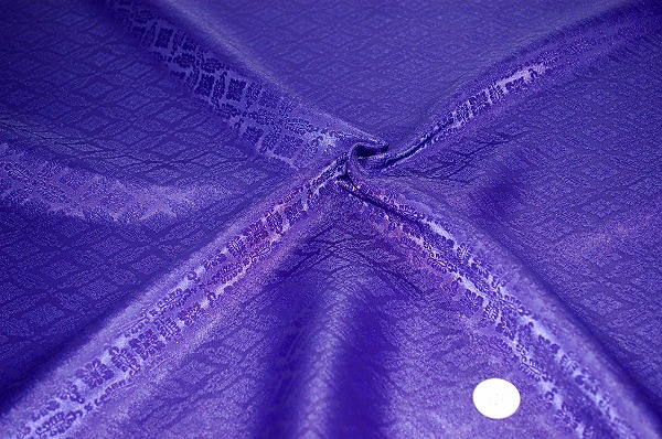 日本の伝統的な菱菊文様の綸子生地(りんず生地)です。紫色・パープルなので訪問着などにお使いいただける着物の生地、和風生地・和柄生地・和布です。お洋服の裏地やよさこい踊り&舞台衣装にもおすすめです。綸子(りんず)とは、繻子織地に繻子織の裏組織で模様を織り出した絹織物の一種です。緞子と似るが、練り糸を使う緞子と異なり、生糸を用いて織り上げた後に精練作業を行う。薄手で地紋が目立ちにくく、緞子に比べると柔らかい質感がある。艶があり滑らかな生地で、女子の着物、特に訪問着などの礼服のほか、長襦袢、伊達衿などにもよく用いられます。綸子生地は、経緯(たてよこ)とも無撚の生糸を使って織り、製織後に精練して用いる後染(あとぞめ)後練(あとねり)の紋織物。一般には地を経の五枚繻子(しゆす)、あるいは八枚繻子として、文様はその裏組織で織り出す。地質が柔らかく、光沢に富むことを特徴とし、染呉服用の生地として広く活用されている。なお上記の本繻子のほかに、緯糸に強撚糸を用いて皺(しわ)を出した綸子縮緬(ちりめん)、四枚変化綾組織による平綸子などがある。