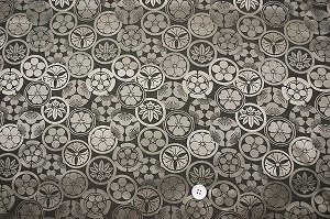 とっても格式高い家紋の綸子生地(りんず生地)です。ゴールドなので訪問着などにお使いいただける着物の生地、和風生地・和柄生地・和布です。綸子(りんず)とは、繻子織地に繻子織の裏組織で模様を織り出した絹織物の一種です。緞子と似るが、練り糸を使う緞子と異なり、生糸を用いて織り上げた後に精練作業を行う。薄手で地紋が目立ちにくく、緞子に比べると柔らかい質感がある。艶があり滑らかな生地で、女子の着物、特に訪問着などの礼服のほか、長襦袢、伊達衿などにもよく用いられます。綸子生地は、経緯(たてよこ)とも無撚の生糸を使って織り、製織後に精練して用いる後染(あとぞめ)後練(あとねり)の紋織物。一般には地を経の五枚繻子(しゆす)、あるいは八枚繻子として、文様はその裏組織で織り出す。地質が柔らかく、光沢に富むことを特徴とし、染呉服用の生地として広く活用されている。なお上記の本繻子のほかに、緯糸に強撚糸を用いて皺(しわ)を出した綸子縮緬(ちりめん)、四枚変化綾組織による平綸子などがある。
