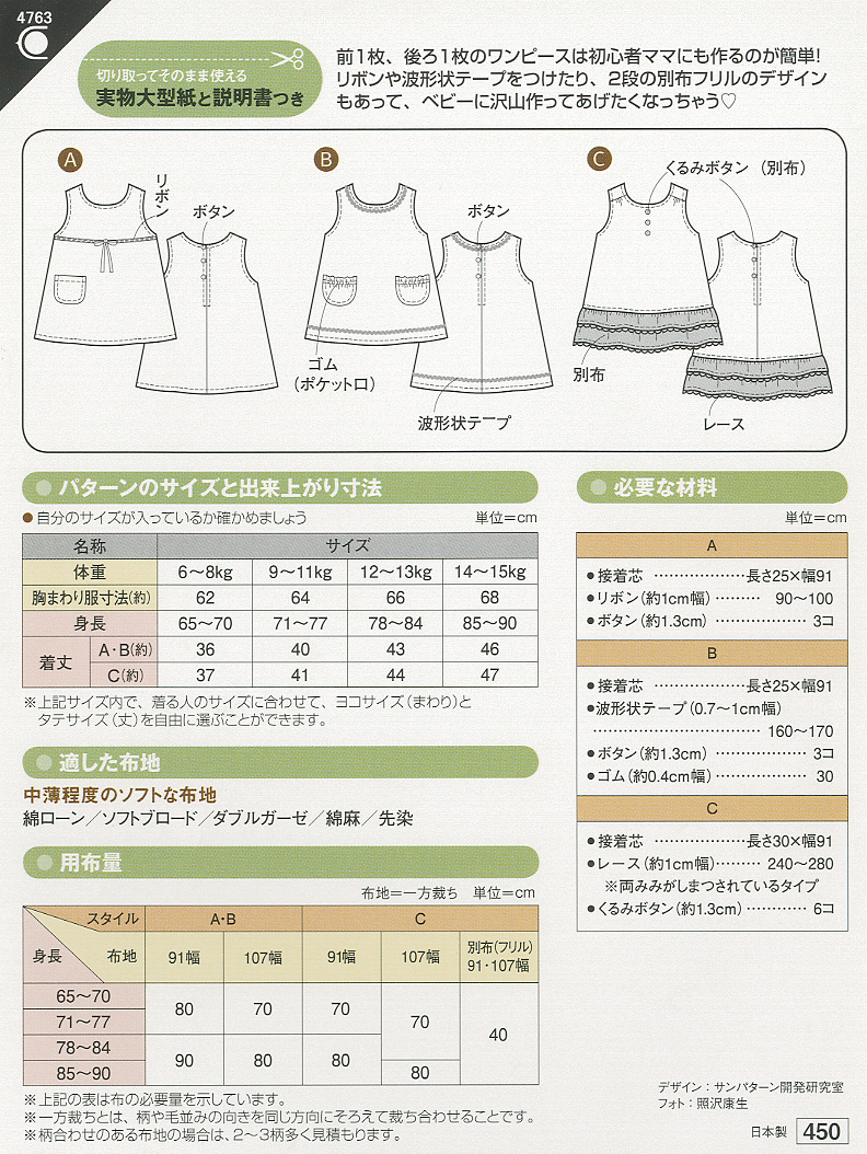 タイプ:ベビー男女(身長65cm~85cm)股下に「まち」を入れ、開閉は簡単に扱えるファスナップを使用して、おむつ交換が楽にできます。衿もとはニットテープでトリミングして、カラーアクセントにしました。肩あきもファスナップを使用。※ミシン針はニット地用針、糸はニット地用糸が必要です。