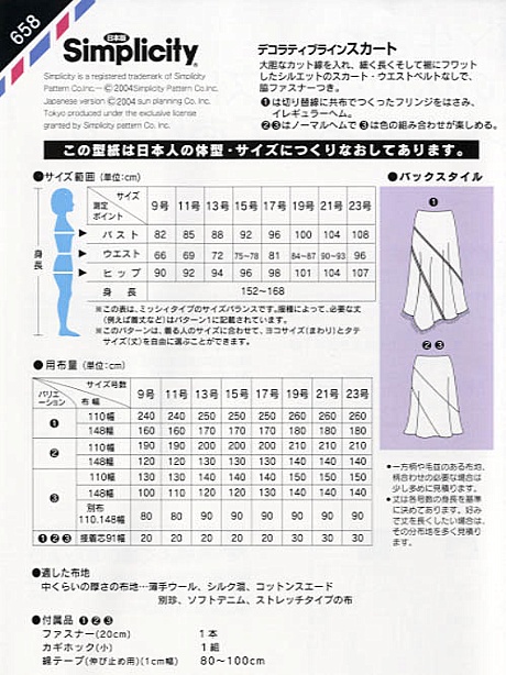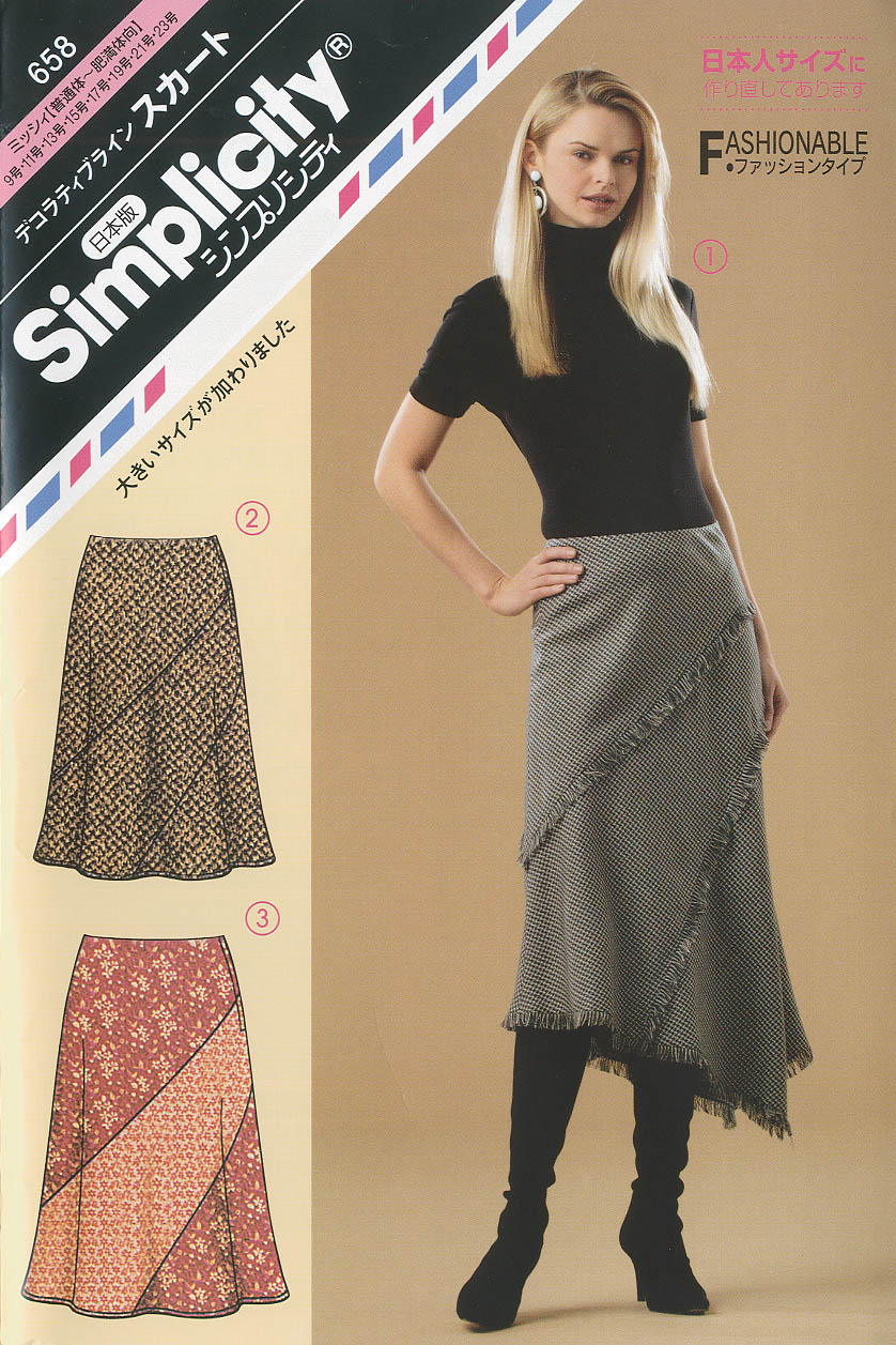 タイプ:ミッシィ(9~23号) 大胆なカット線を入れ、細く長くそして裾にフワッとしたシルエットのスカート。 ウエストベルトなしで、脇ファスナーつき。 デザイン1は、切り替え線に共布で作ったフリンジをはさんだイレギュラーヘム。 デザイン2・3はノーマルヘムで、デザイン3は色の組み合わせが楽しめる