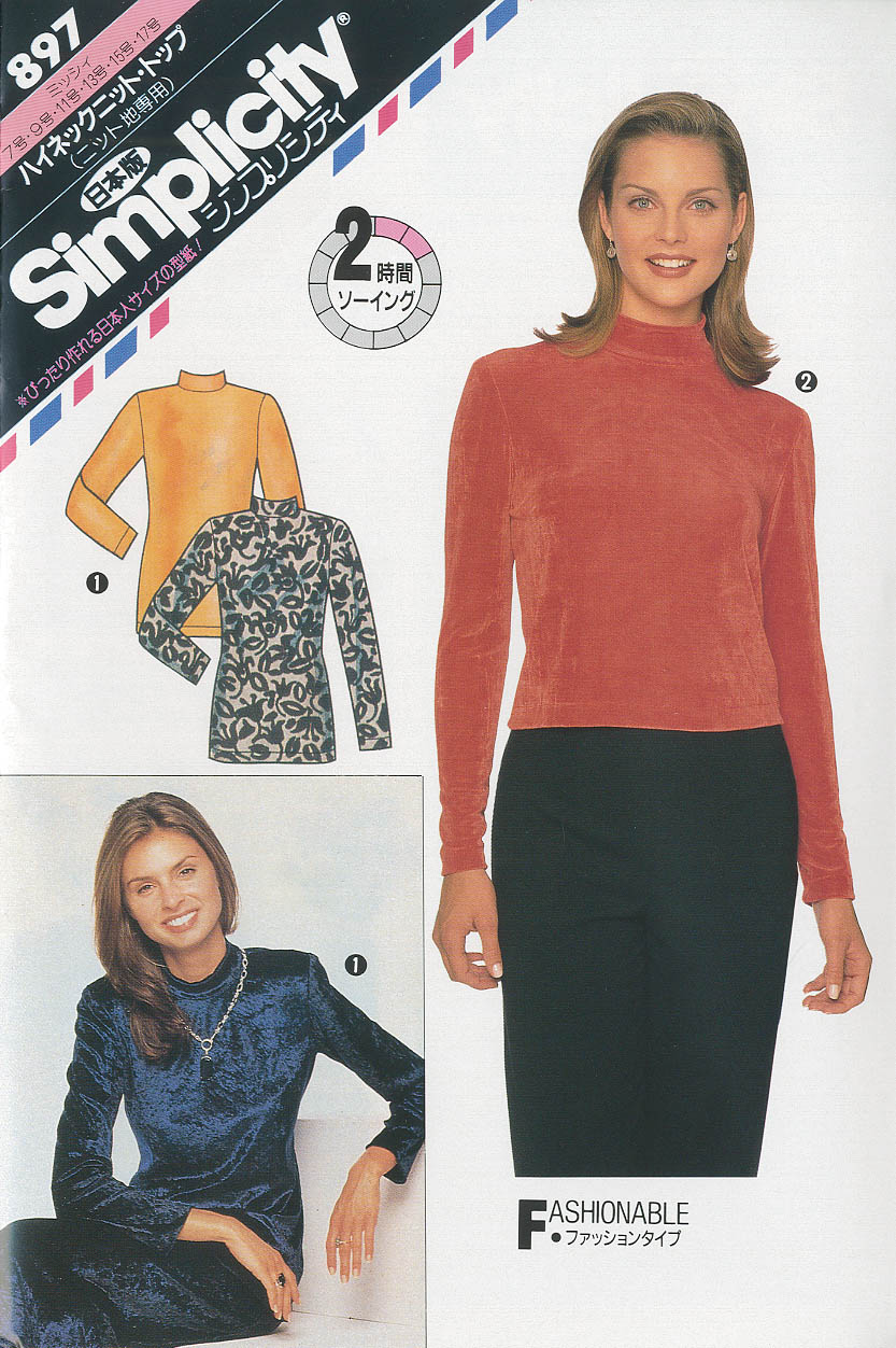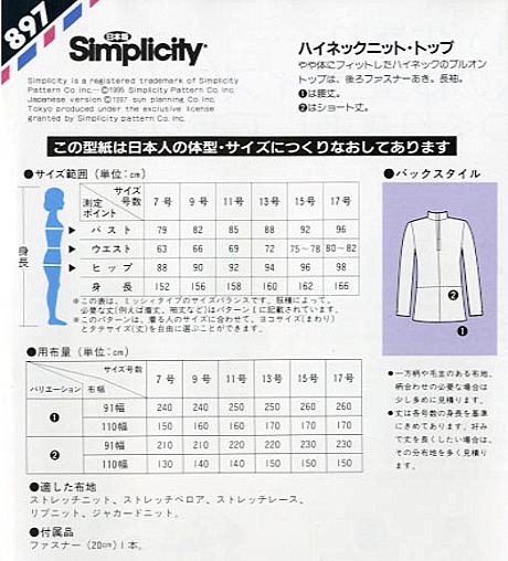 タイプ:ミッシー(7~17号) 伸び縮みする布地専用。 裾に向かって広がるドレープが腰まわりをカバーしてくれるチュニック。首元のスヌードは布地を変えて着こタイプ:ミッシィ(7~17号) 身体に程よくフィットしたハイネックで長袖のプルオントップ。 後ろファスナーあき。 腰まで隠れる長めの丈と、短めのブラウス丈の着丈2種。 ※糸はニット用糸、ミシン針はニット用針が必要です。なしのアクセントに。 1.Vネックで、8分袖 2.ラウンドネックで、5分袖 3.布帛(薄手)のスヌード(筒状のスカーフ) 適した布地 1と2はやや薄手~中肉タイプのニット地(ジャージー/天竺ニット/ジャカードニット/ベロアニット) 3は薄手~やや薄手の軽いソフトな布地(ローン/ボイル/バックサテン/ジョーゼット/シルク混)