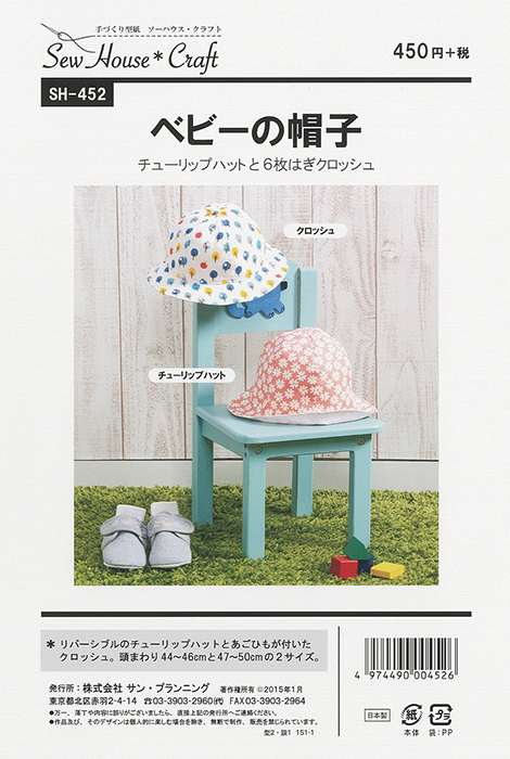 赤ちゃんを紫外線から守る、リバーシブルのチューリップハットとあごひもが付いたクロッシュのデザイン2種。 頭まわり44~46cmと47~50cmの2サイズ。縫い代付き。 プレゼントにも最適です。