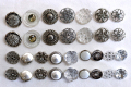 メーカー廃番品 ヴィンテージ ジルコニア入 アンティークボタン シルバー系gt140 (16組)。キラキラ系アクセサリー作家さんへオススメのボタンを集めてみました。セレブ感のあるアソート。バレッタやピアスなどのアクセサリーから、カルトナージュのワンポイントなど、いろいろと工夫してください。廃業されたボタン屋さんから引き取った超高級品も入っています!