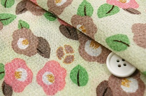 レトロなちりめん友禅 金彩生地 可愛い椿柄 つばきの和風生地 クリーム色地 約70cm×約50cmカット (0647-59)
