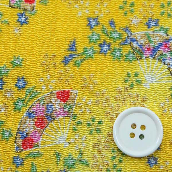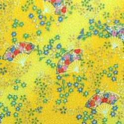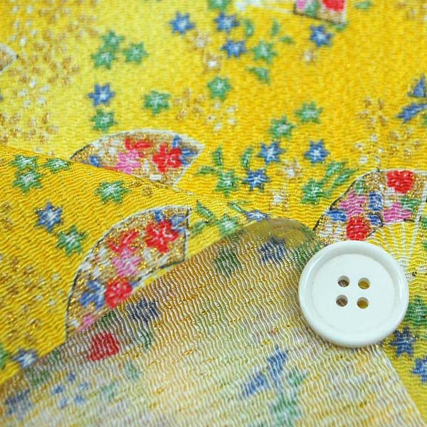 レーヨンちりめん友禅金彩生地 小花と扇と流水 黄色 約70cm×約50cmカット 0648-01